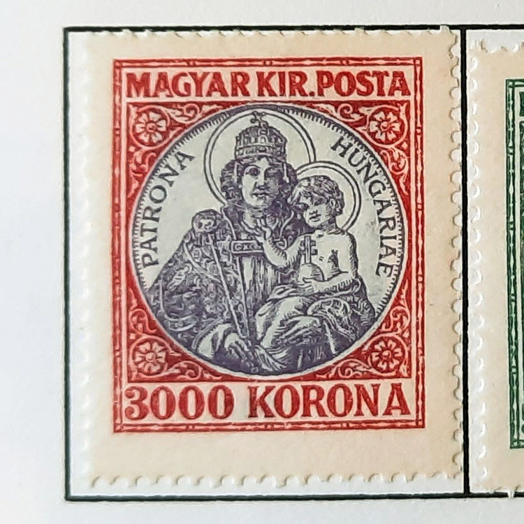 In Part 1 of this post, I speculated about why the Virgin Mary was chosen as Hungary’s Patroness, as well as taking a look at other stamps with “Patrona Hungariae” on them. Today, let’s look at the stamp in question in more detail. Ready?