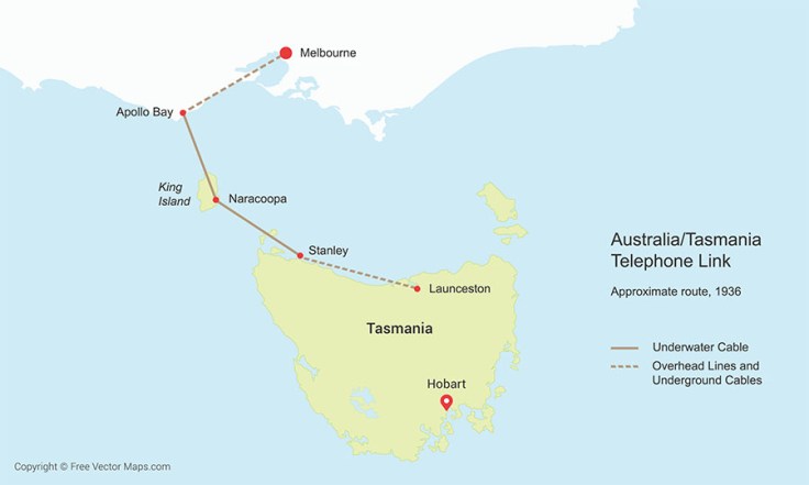 Its length of 161 nautical miles is divided into two sections. The northern section, 79 miles in length, joins King Island to Apollo Bay, Victoria, and then by overhead lines and underground cables joins the trunk exchange at Melbourne. The southern section from [Naracoopa,] King Island goes to the northern coast of Tasmania and then by land line to the Launceston exchange. Inter-connexion [sic] is thus effected with the existing network of communications in Australia and Tasmania.