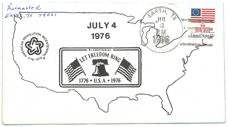 Since Marshal Kelley’s retirement in 1960, there have been a number of other postmasters in Earth, Texas. When the Bicentennial cover above was signed by the postmaster in 1976, the position was held by Harold D. Miller, Kelley’s immediate successor. But since 1980, more than a dozen Earthlings have held the post.