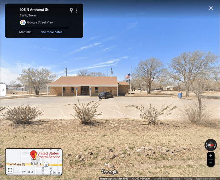 When he founded the town, William Halsell placed Good Earth’s city hall and post office near the geographic center of what was plotted. Located just a block off Main Street, today’s Earth post office (current postal code 79031) is a modest beige brick building that looks like it was designed to blend into the Texas scrublands.