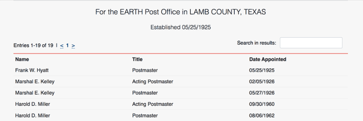 So, there we have it! The honor of serving as Earth’s first postmaster goes to Contender 1, Frank W. Hyatt, son-in-law of Ora H. Hume, the man who applied for the town’s post office. Hyatt only served for 274 calendar days, compared with his successor’s nearly 35 years in the position. But we can say officially that he was the first postmaster of Earth.