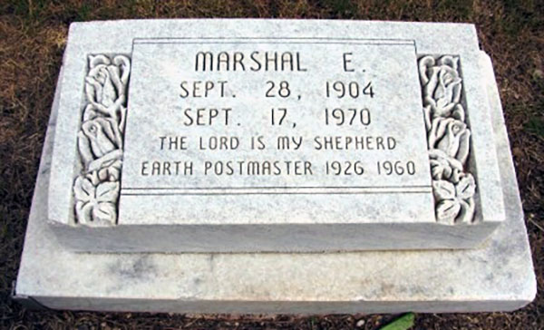 Meanwhile, the town’s very own historical marker places “Marshall Kelley” behind the postal counter. Marshal Edwin Kelley was born on September 28, 1904. He grew up the middle of three siblings and married Eula Maye Green in 1926. The two had one child, Gwyndene, the next year. It must have been a busy time for Kelly. According to his gravestone, he began his position as Earth’s postmaster in 1926 and served until 1960. Kelley would live until September 17, 1970 and was buried in Earth Memorial Cemetery.