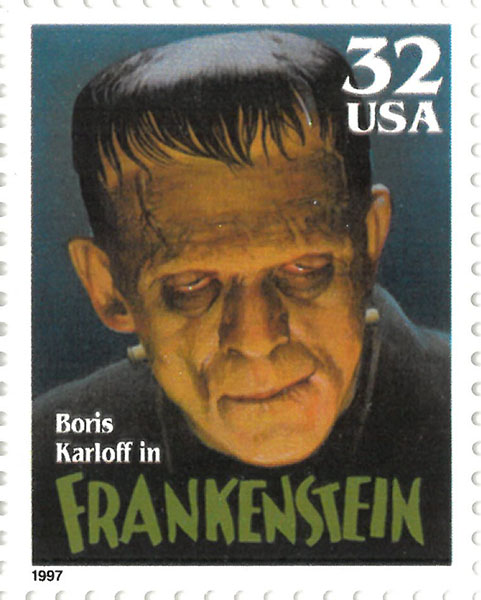 This blog has covered the five commemorative stamps honoring the silver screen’s Universal Monsters before. Universal Studios released more than 40 monster films during the period of 1931–1956. In 1931, Boris Karloff starred in “Frankenstein” as the titular mad scientist’s monstrous creation. Universal’s “Frankenstein” is not the most faithful adaptation of the Mary Wollstoncraft Shelley novel—that honor is generally awarded to Kenneth Branagh’s 1994 film. However, Karloff set the bar for how Frankenstein’s monster would be portrayed on screen and in pop culture for the rest of the 20th century and beyond.