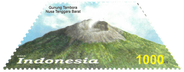 In 2003, Indonesia issued a set of stamps depicting volcanoes of the Indonesian islands. Ranging from 500–2,000 Rp, the page of 10 stamps and two labels commemorates “50 years of successful ascents of Everest, 29 May 1953”. Two each of five designs feature the volcanoes of Mount Kerinci, Jambi; Mount Krakatau, Lampung; Mount Merapi, Jawa Tengah; Mount Tambora, Nusa Tenggara Barat; and Mount Ruang, Sulawesi Utara. To best depict the shield volcano Tambora and its kin, Indonesia issues the stamps as wide trapezoids, among the few stamps I’ve seen in that shape.