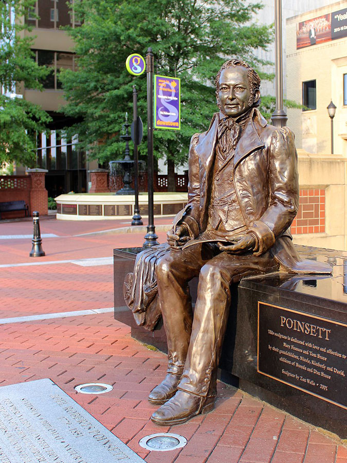 Today, more than 100 cultivated varieties of poinsettia have been patented in the U.S., reflecting its position as the most economically important potted plant grown in the world. December 12 is National Poinsettia Day, so chosen to mark the death of Joel Roberts Poinsett. Poinsett’s legacy in Greenville can also be seen in the Poinsett Bridge, Poinsett Club, and the landmark Poinsett Hotel downtown. The Poinsettia Christmas Parade has signaled the start of the holiday season in Greenville for more than 75 years.