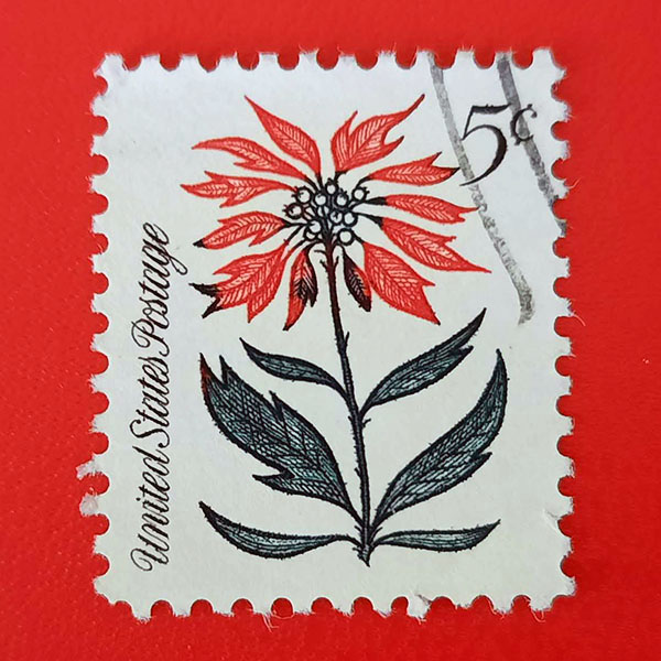 This was one of four se tenant holiday stamps in 1964, the third year the U.S. issued Christmas stamps. The stalk and bracts look spindly compared to today’s fuller cultivated plants, but makes for a cheerful illustration. The other designs in the set include holly, mistletoe, and a sprig of conifer.
