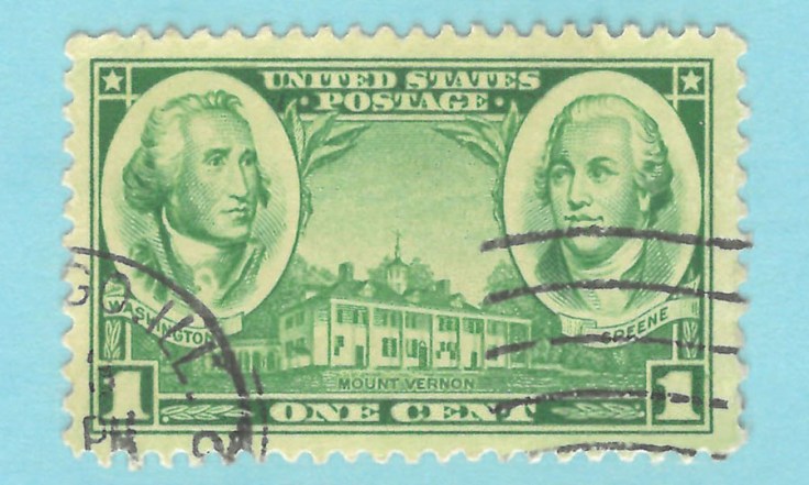 The first stamp in this series was a one-cent green stamp with George Washington’s residence at Mount Vernon as its central design. Portraits of Washington and Nathanael Greene inside oval cameos flank the image of the house. As one of Washington’s most valued generals, Greene was widely viewed as the “heir apparent” if Washington was killed or incapacitated in the war. His valuable service to the country was well remembered a century and a half later, at the time these stamps were issued.