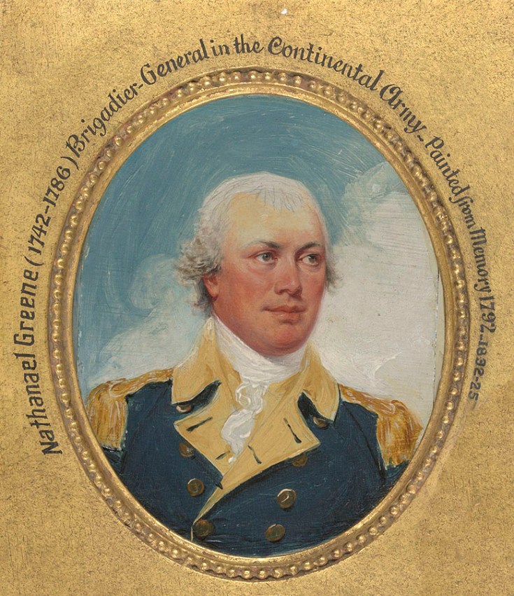 Major-General Nathanael Greene (1742–June 19, 1786) served in the Continental Army during the Revolutionary War and earned a reputation as one of George Washington’s most talented and dependable officers. In October 1780, Greene took command of the Southern theater of the conflict, successfully engaging in guerilla warfare against the more numerous British forces led by Lord Charles Cornwallis.