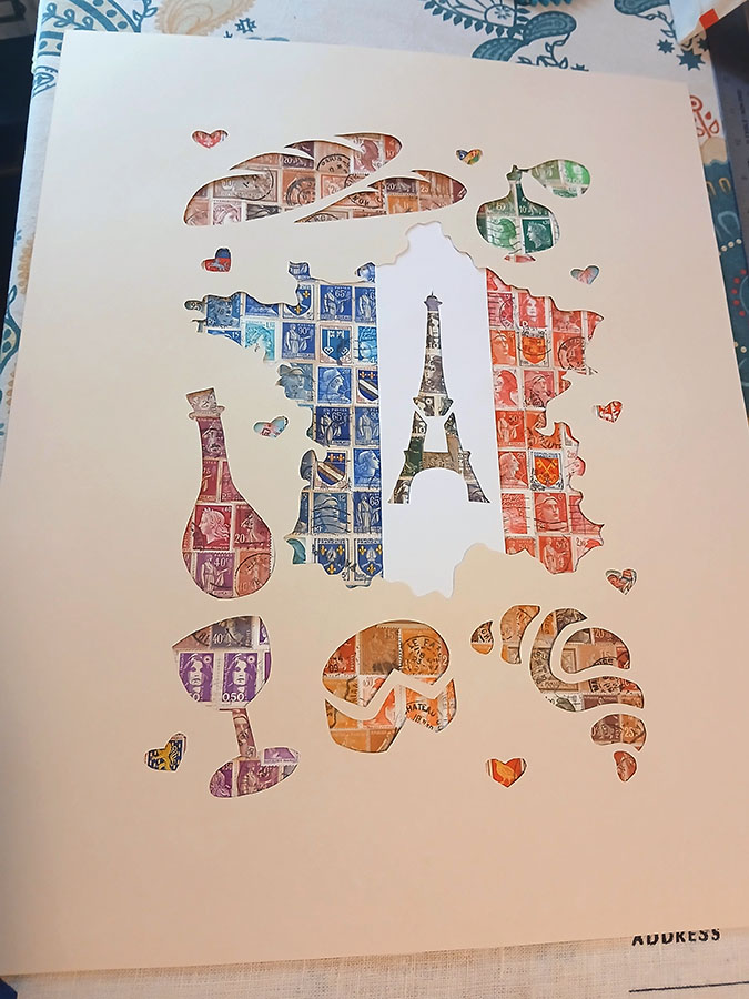 I wanted the map of France that makes up the centerpiece of the project to depict the colors of the French flag. But I also didn’t want too much white space because of the white stripe. I decided to use a strip of white art paper for the stripe, but create a cutout of the Eiffel Tower. I affixed it to the top sheet using archival quality tape.